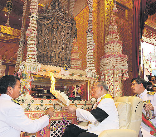 His Majesty the King sets ablaze a sandalwood flower before laying it under the royal urn housing the remains of Her Royal Highness Princess Bejaratana Rajasuda. PALACE PHOTO