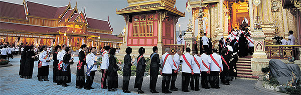 Mourners line up in front of the royal pyre at Sanam Luang to lay sandalwood flowers to bid their final farewell to the late Princess Bejaratana Rajasuda. PALACE PHOTO